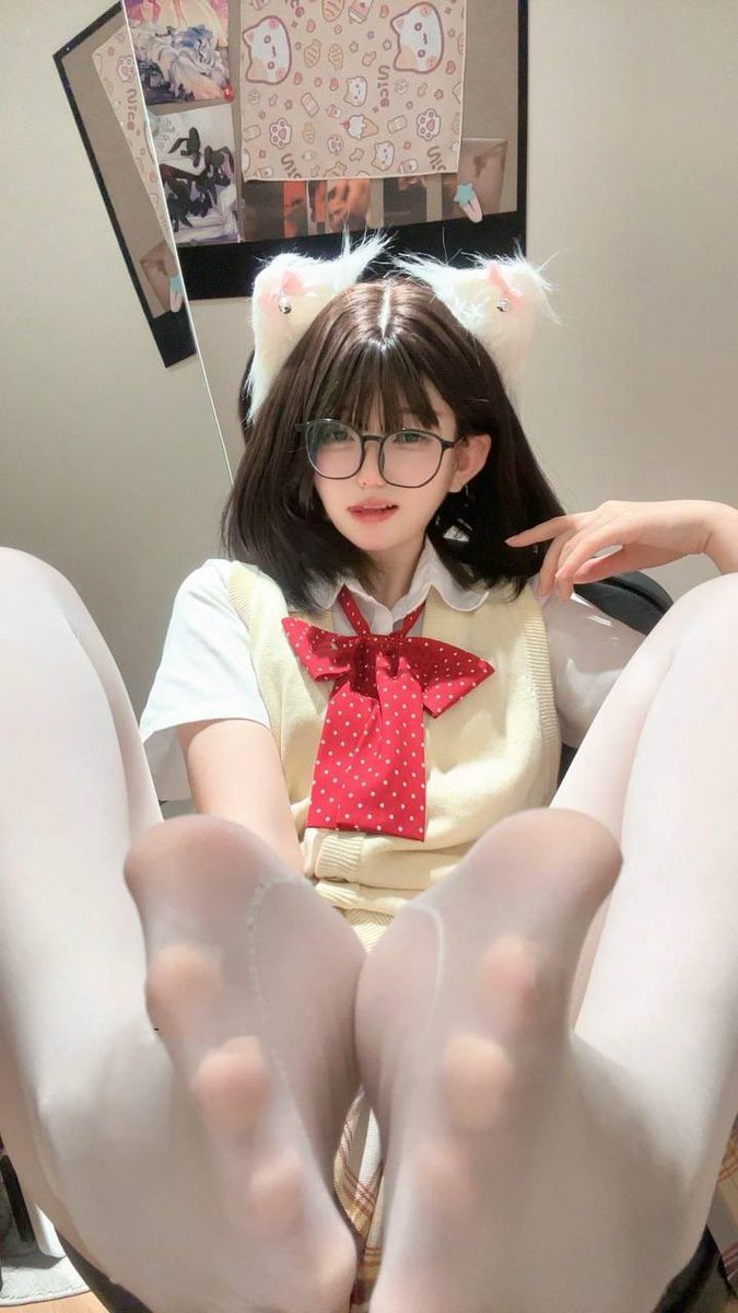 Schoolgirl Bunny Girl Feet Soles Toes Ankles Calves Knees Thighs Legs Short Hair Black Hair Bangs Fringe Twin Tails Ankle Socks Lace Socks Sheer Stockings White Stockings Uniform Blouse Skirt Indoor Studio Floor Chair Sitting Crossed Legs Stepping Close Up Foot Focus Natural Light Soft Light Shy Sole Creases Shiny Skin Smiling Mirror View Arms