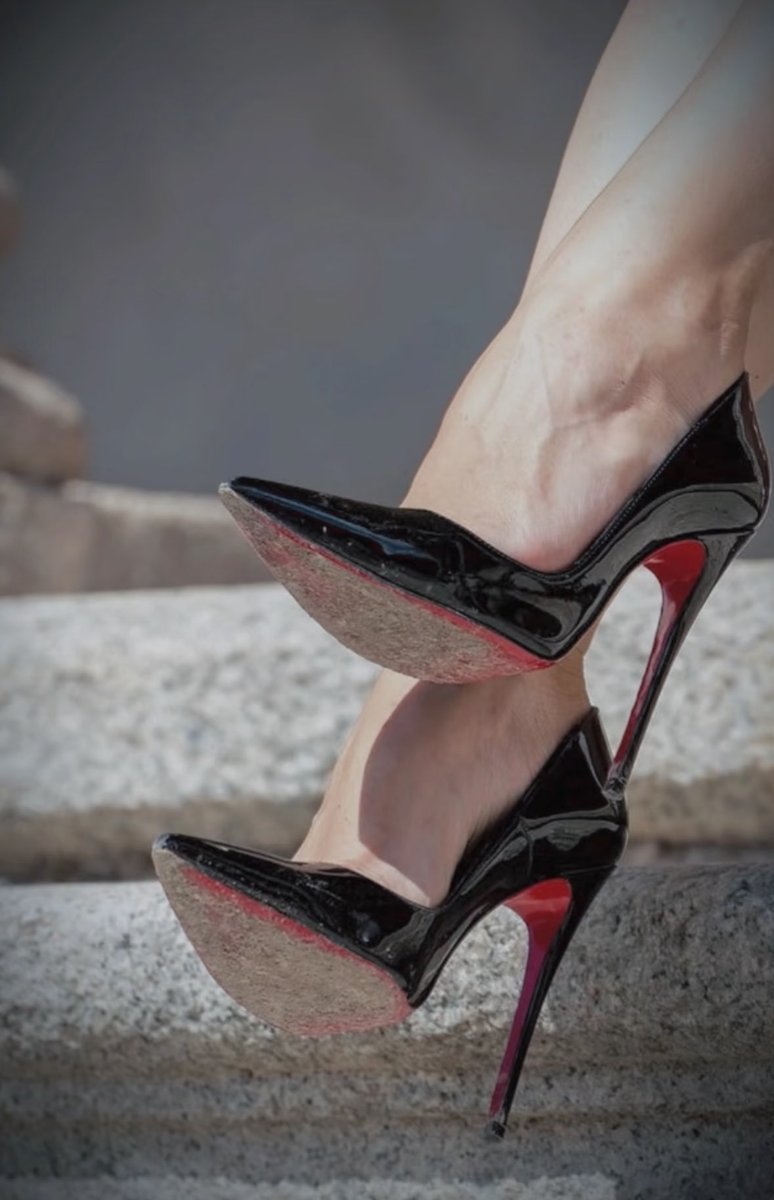 Soles Heels Ankles Calves Knees Thighs Legs Long Hair Black Hair Straight Hair Fringe Stilettos Blouse Outdoor Street Standing Tiptoeing Walking Full Body Low Angle Natural Light Confident Sole Creases