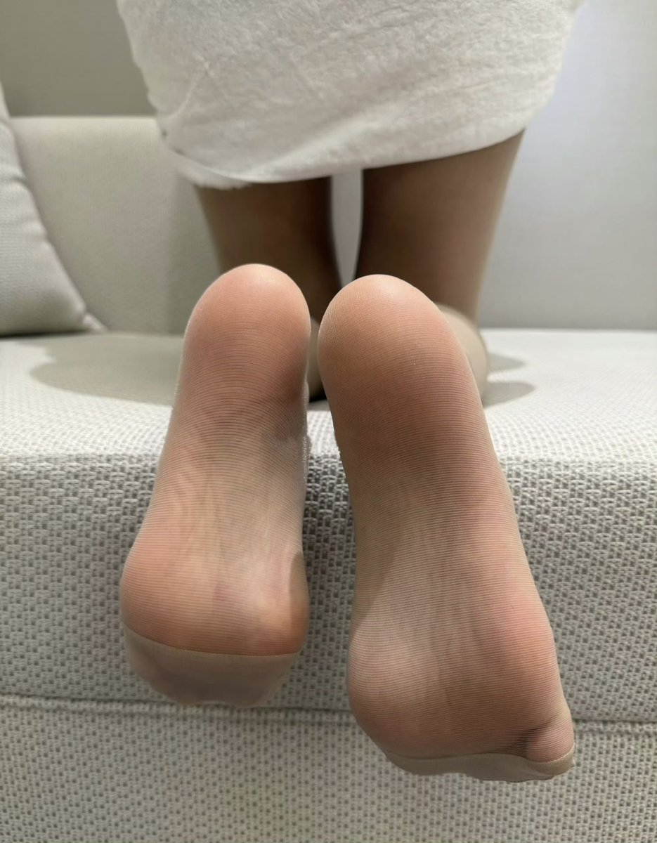 Soles Toes Heels Ankles Calves Knees Thighs Legs Sheer Stockings Zettai Ryouiki Absolute Territory Mesh Heels Stilettos Dress Skirt Indoor Living Room Sofa Sitting Crossed Legs Crossing Feet Nude Nail Color Sole Creases High Arch Close Up Foot Focus Natural Light Shy Seductive