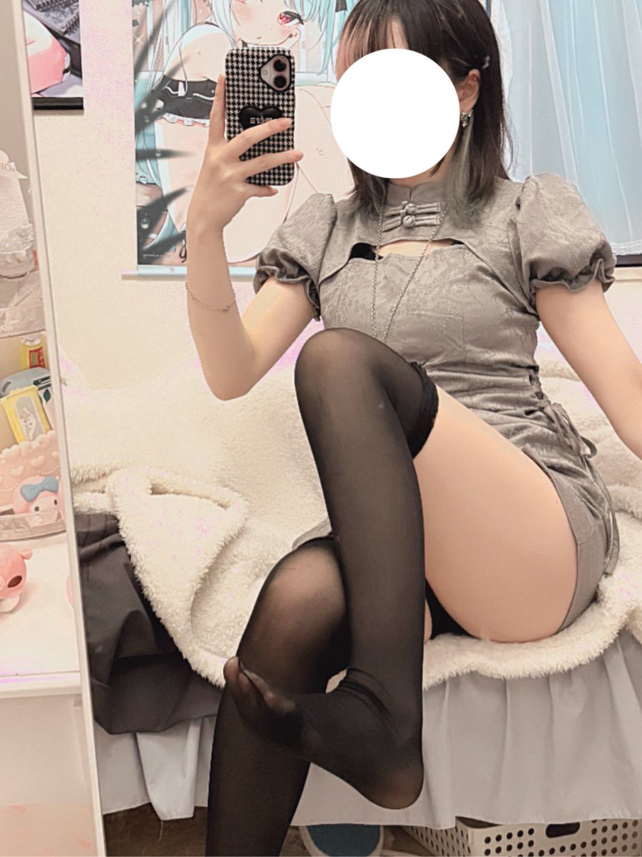 Chinese Style Feet Soles Toes Ankles Calves Knees Thighs Legs Long Hair Black Hair Bangs Fringe Knee High Socks Black Stockings Shoes Removed Dress Garter Belt Indoor Bedroom Floor Sitting Crossed Legs Stepping Full Body Mirror View Soft Light Shy Lace Sole Creases Shiny Skin