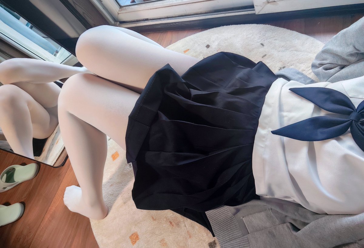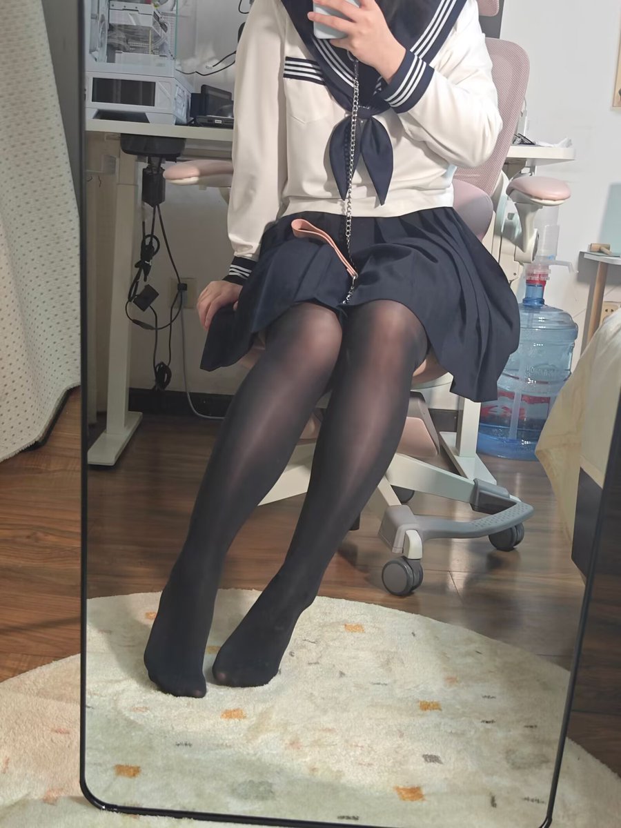 Uniform Legs Ankles Knees Calves Long Straight Black Hair Fringe Bangs Knee High Socks Opaque Stockings Heels Skirt Indoor Bedroom Floor Carpet Sitting Crossed Legs Mirror View Full Body Natural Light Shy Sole Creases Shiny Skin