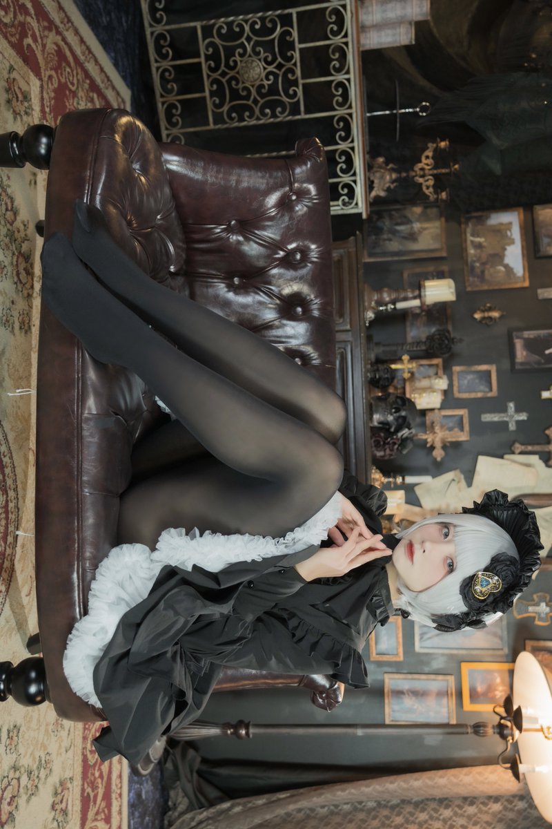 Gothic Feet Soles Ankles Calves Long Straight Black Hair Fringe Bangs Hair Accessory Knee High Socks Black Stockings Dress Coat Indoor Living Room Carpet Floor Sitting Crossed Legs Resting Full Body Staged Shy Lace Sole Creases Shiny Skin