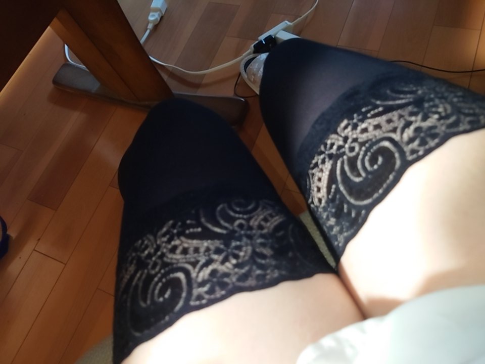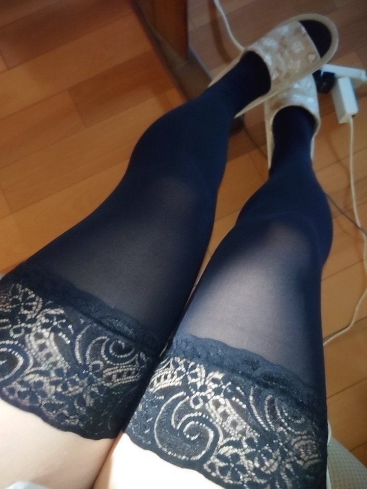 Ankles Calves Knees Thighs Long Straight Black Hair Fringe Knee High Socks Lace Socks Black Stockings Opaque Stockings Slippers Sandals Lingerie Indoor Floor Standing Crossed Legs Stepping Full Body Natural Light Shy Lace Sole Creases High Arch