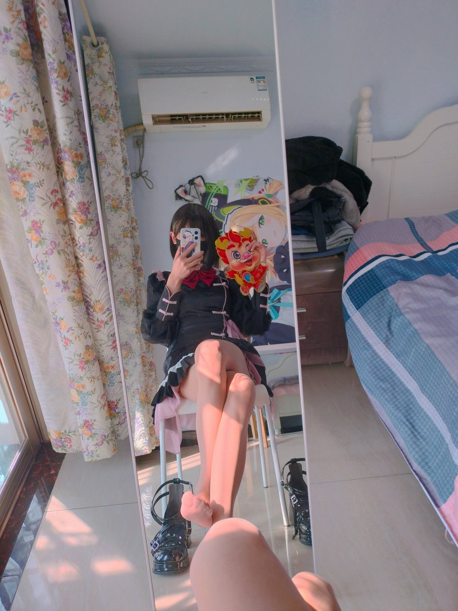 Lolita Legs Calves Knees Ankles Feet Soles Toes Long Hair Twin Tails Colored Hair Pigtails Long Straight Black Hair Hair Accessory Ankle Socks Lace Socks Black Stockings Sheer Stockings Heels Ankle Boots Dress Skirt Indoor Bedroom Floor Standing Crossed Legs Stepping Full Body Mirror View Neon Light Shy Lace Ribbons Smiling Embarrassed