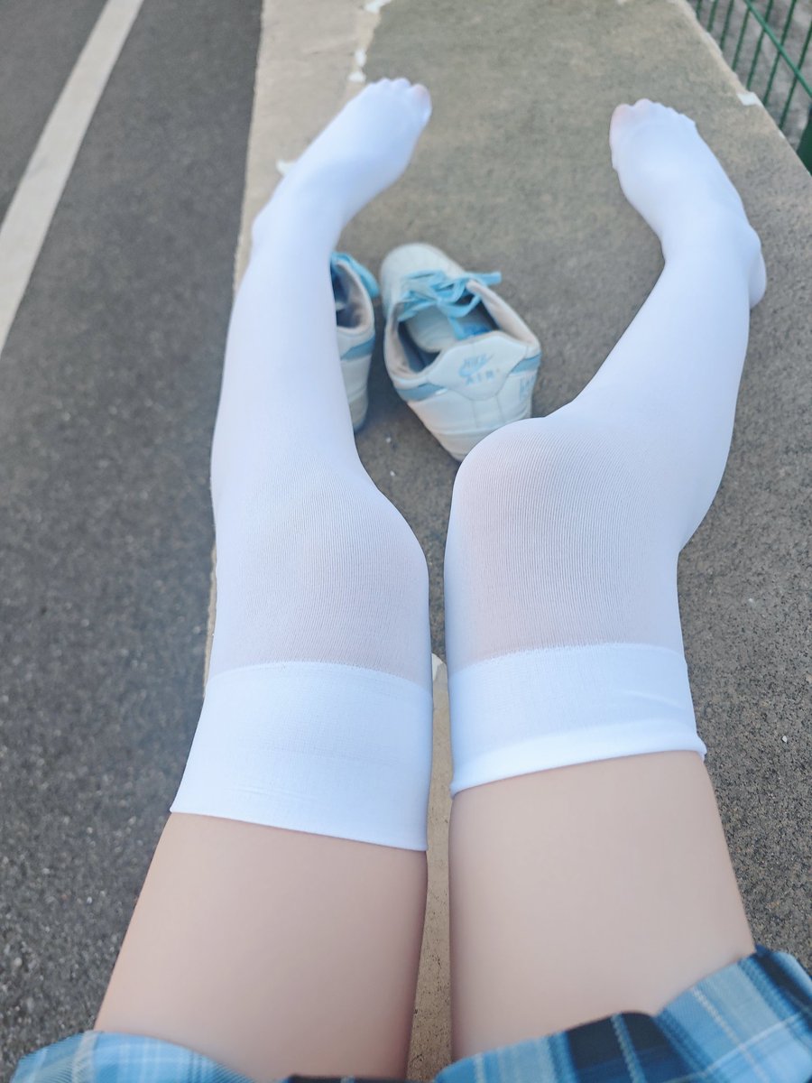 Legs Ankles Knees Calves Knee High Socks Lace Socks Sneakers Skirt Outdoor Street Sitting Crossed Legs Resting Full Body Natural Light Shy Lace Sole Creases Shiny Skin