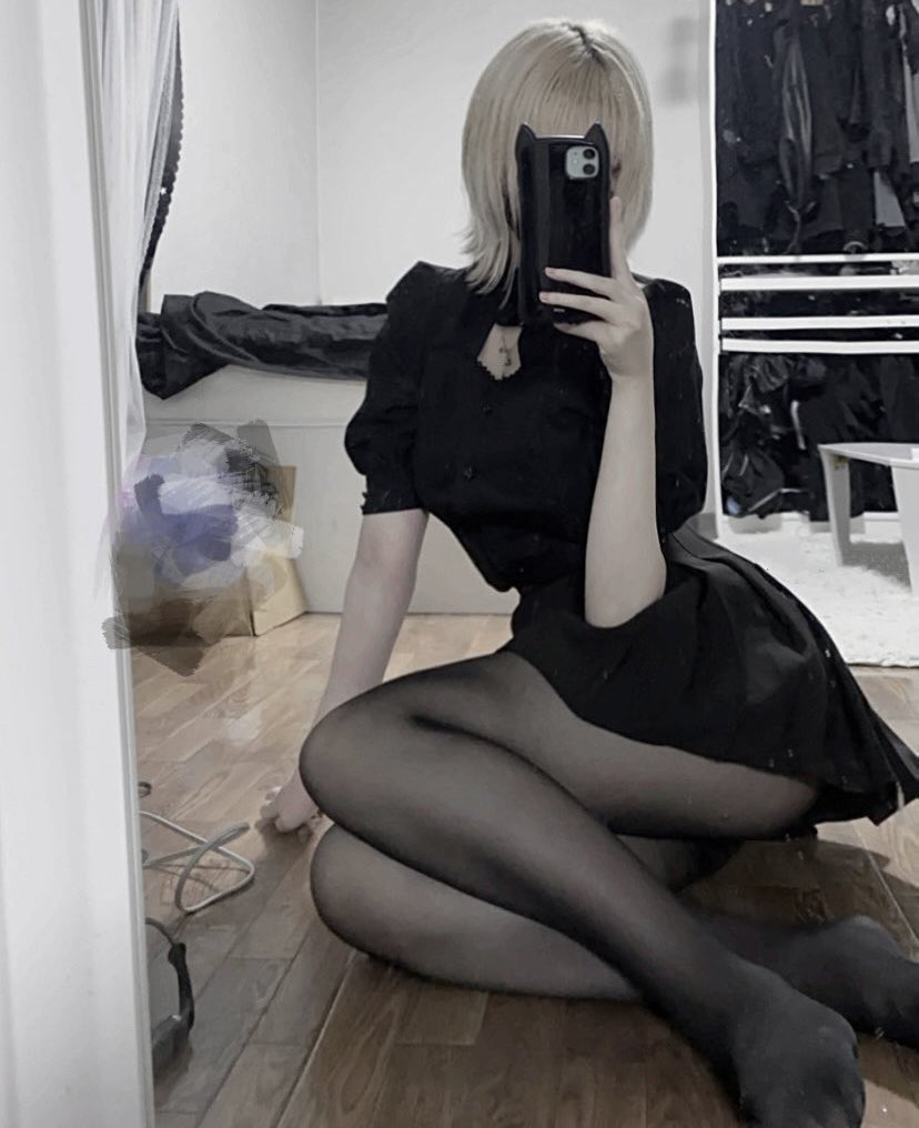 Skirt Blouse Ankle Socks Opaque Stockings Black Stockings Indoor Bedroom Mirror View Full Body Kneeling Crossed Legs Shiny Skin Shy Embarrassed Long Hair Black Hair Bangs Fringe Stepping Crossing Feet POV