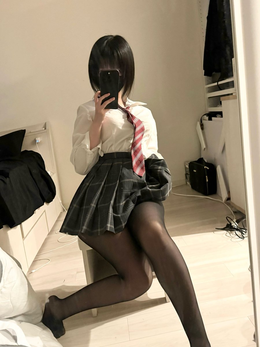 Uniform Skirt Blouse Tights Black Stockings Opaque Stockings Ankle Socks Shoes Removed Indoor Bedroom Mirror View Full Body Kneeling Crossed Legs Shiny Skin Shy Embarrassed Stepping Zettai Ryouiki Absolute Territory Long Hair Black Hair Fringe Bangs POV
